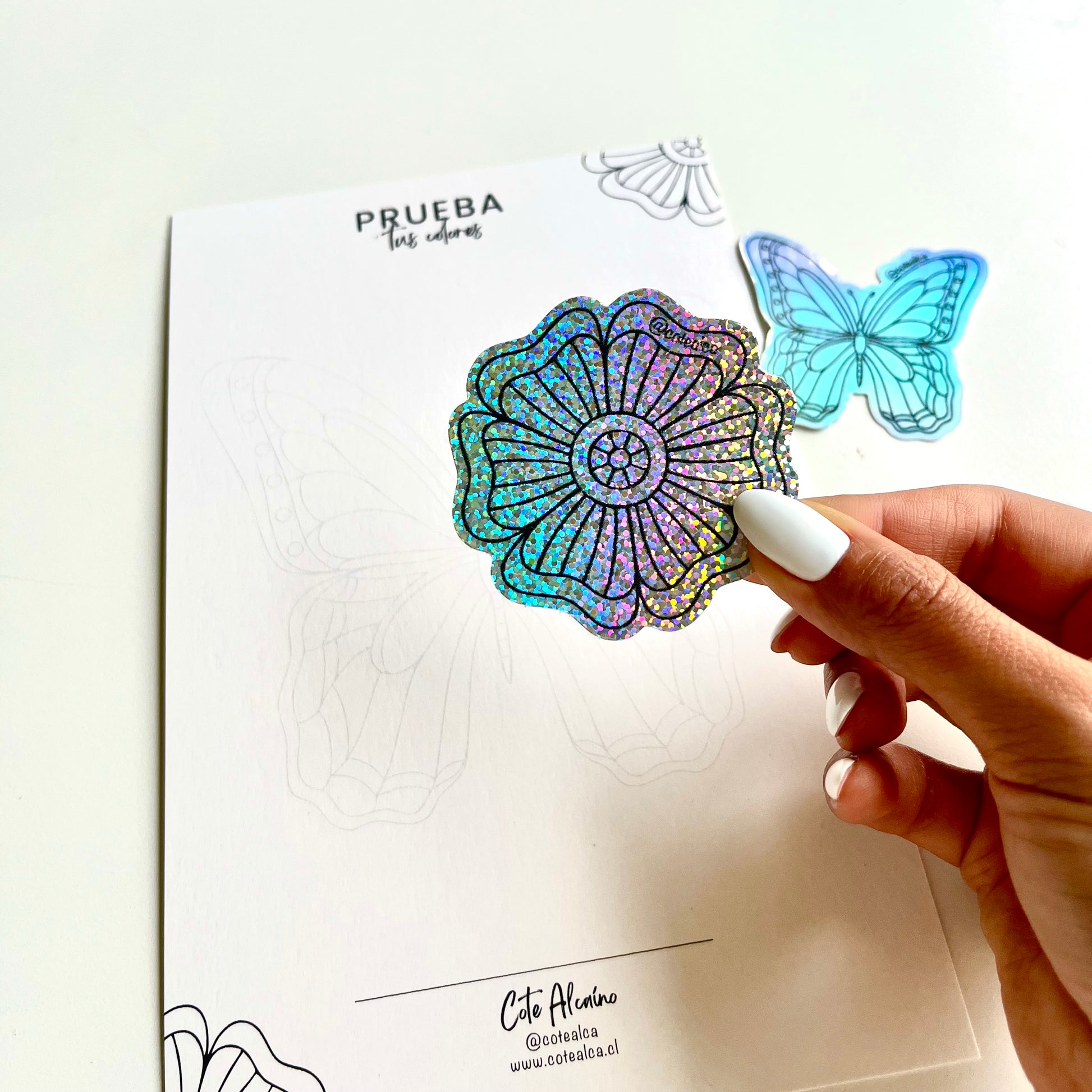El pack contiene 2 stickers tamaño 6x6cm, y una tarjeta para probar tus colores que mide 14x22cm y tiene un gramaje de 240 grs (la misma hoja de los libros para colorear)